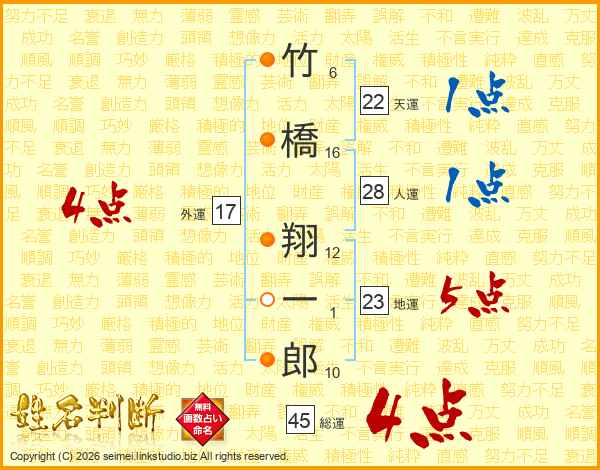竹(6画)橋(16画) 翔(12画)一(1画)郎(10画)
