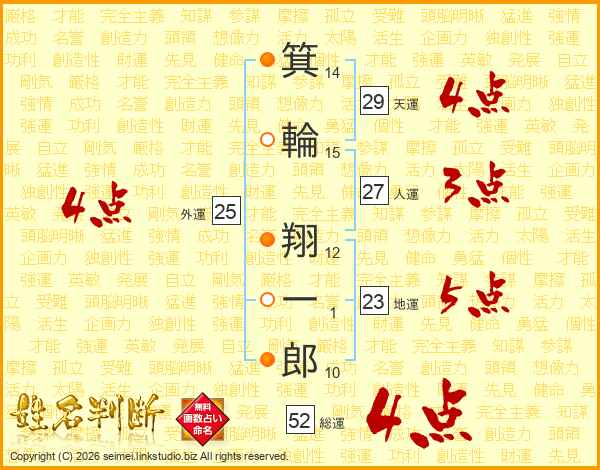 箕(14画)輪(15画) 翔(12画)一(1画)郎(10画)
