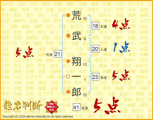 荒(10画)武(8画) 翔(12画)一(1画)郎(10画)