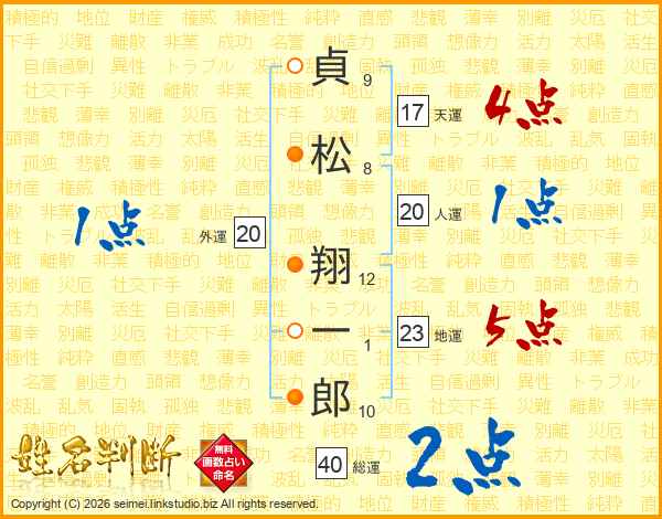 貞(9画)松(8画) 翔(12画)一(1画)郎(10画)