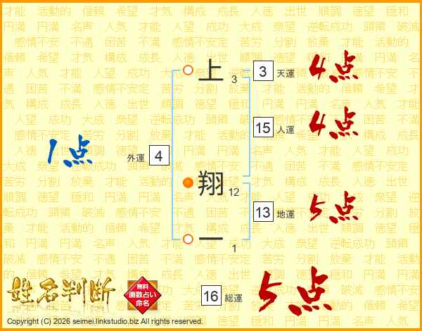 生活面を象徴する運勢です。外部から受ける影響力を表し、結婚運、家庭運や職場、環境への順応性を表します。総運から人運を引いた画数。姓や名が1文字の場合を除く。