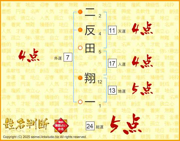 生活面を象徴する運勢です。外部から受ける影響力を表し、結婚運、家庭運や職場、環境への順応性を表します。総運から人運を引いた画数。姓や名が1文字の場合を除く。