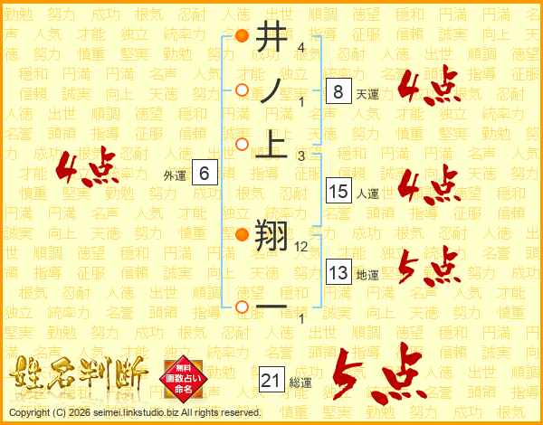 井ノ上翔一さんの総運は21画の5点!