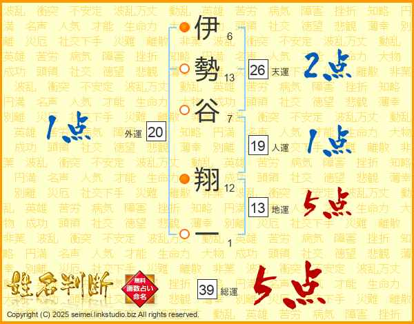 伊(6画)勢(13画)谷(7画) 翔(12画)一(1画)