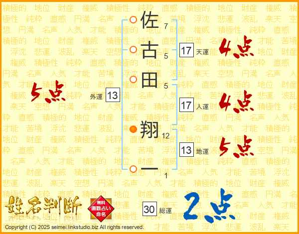 佐(7画)古(5画)田(5画) 翔(12画)一(1画)