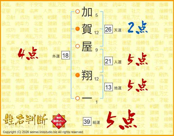 加(5画)賀(12画)屋(9画) 翔(12画)一(1画)