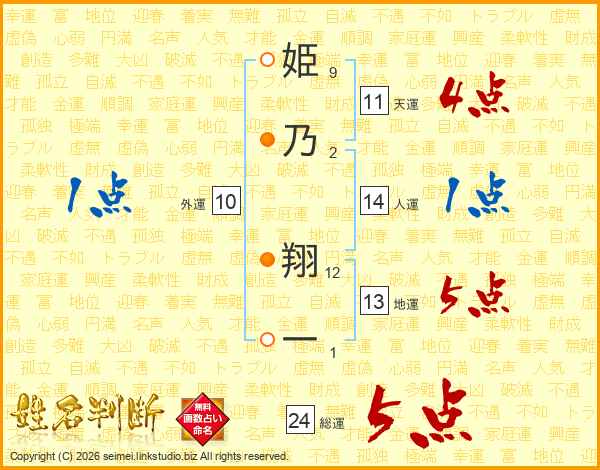 姫(9画)乃(2画) 翔(12画)一(1画)