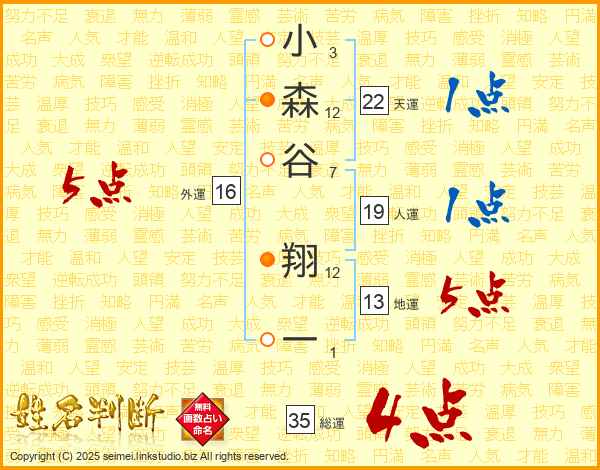 小(3画)森(12画)谷(7画) 翔(12画)一(1画)