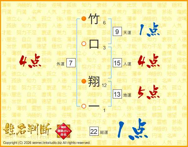 生活面を象徴する運勢です。外部から受ける影響力を表し、結婚運、家庭運や職場、環境への順応性を表します。総運から人運を引いた画数。姓や名が1文字の場合を除く。