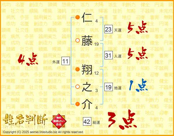 仁(4画)藤(19画) 翔(12画)之(3画)介(4画)