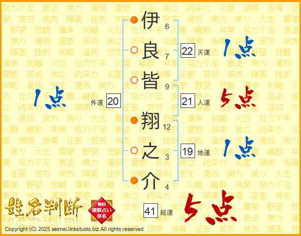 伊(6画)良(7画)皆(9画) 翔(12画)之(3画)介(4画)