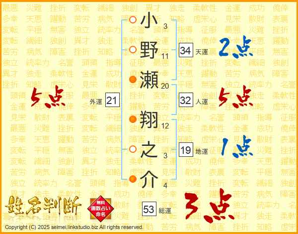 小(3画)野(11画)瀬(20画) 翔(12画)之(3画)介(4画)