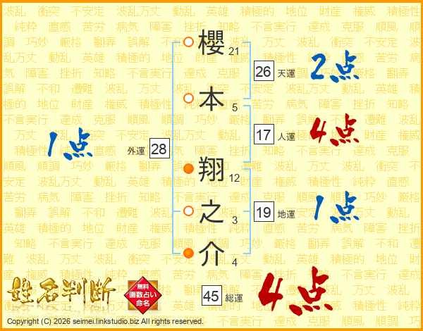 櫻本翔之介さんの総運は45画の4点!