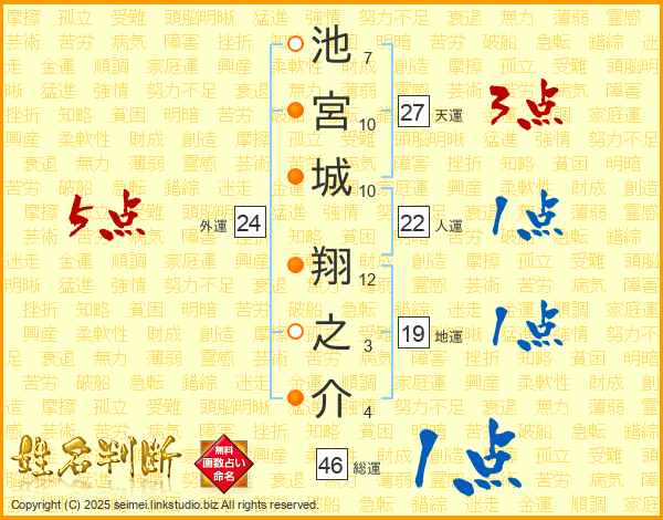 池(7画)宮(10画)城(10画) 翔(12画)之(3画)介(4画)