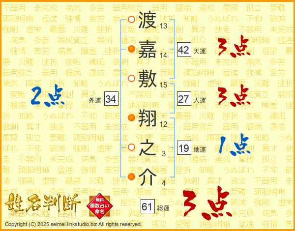 渡(13画)嘉(14画)敷(15画) 翔(12画)之(3画)介(4画)