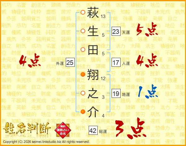 萩(13画)生(5画)田(5画) 翔(12画)之(3画)介(4画)