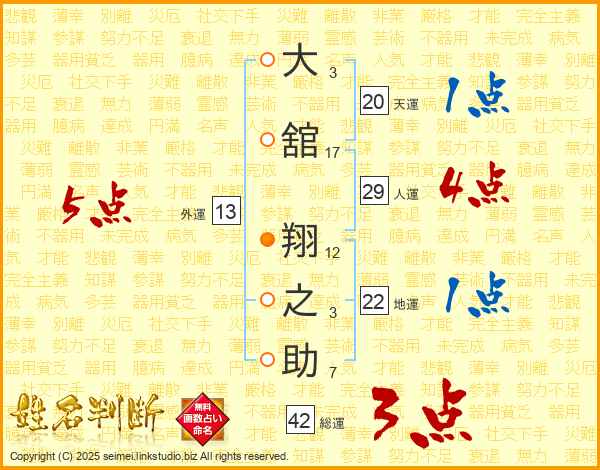 大(3画)舘(17画) 翔(12画)之(3画)助(7画)