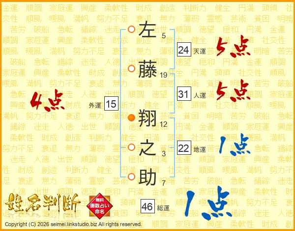 左(5画)藤(19画) 翔(12画)之(3画)助(7画)