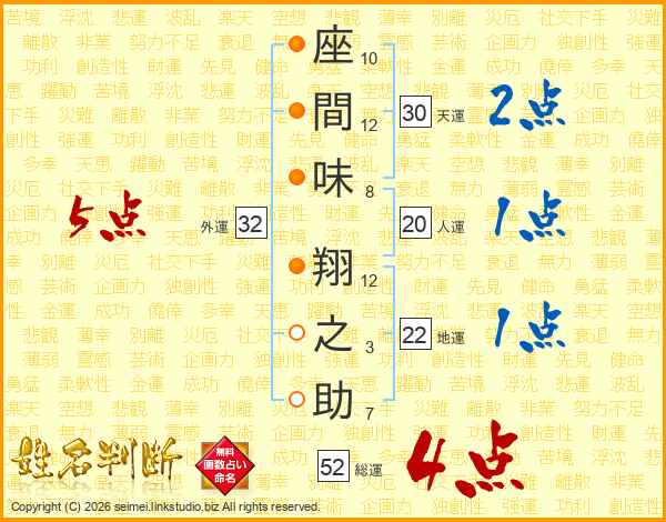 座(10画)間(12画)味(8画) 翔(12画)之(3画)助(7画)