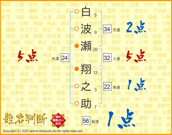白(5画)波(9画)瀬(20画) 翔(12画)之(3画)助(7画)