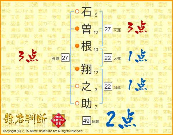 石(5画)曽(12画)根(10画) 翔(12画)之(3画)助(7画)