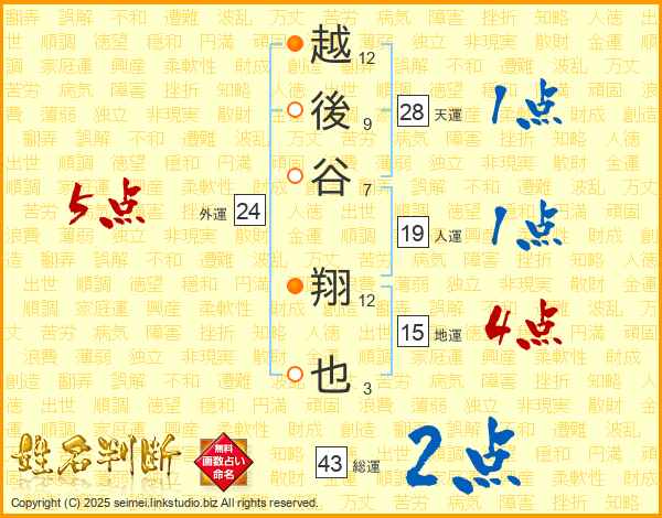 越(12画)後(9画)谷(7画) 翔(12画)也(3画)