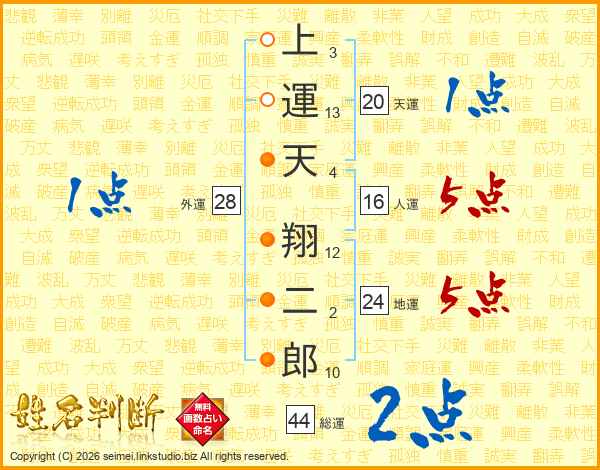 上運天翔二郎さんの総運は44画の2点!