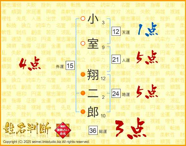 小(3画)室(9画) 翔(12画)二(2画)郎(10画)