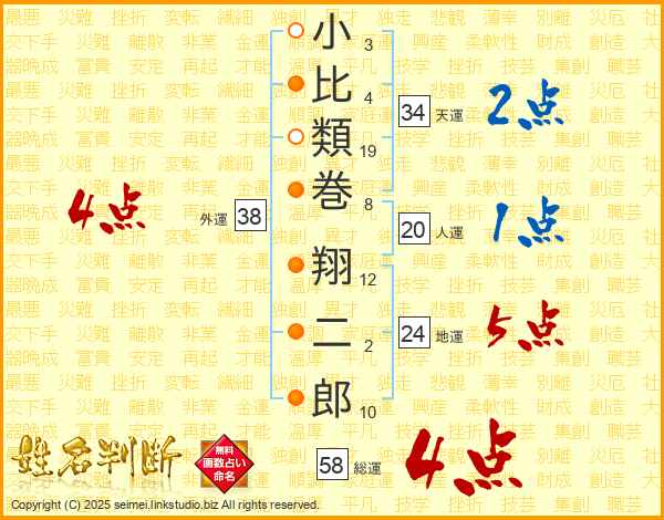 小(3画)比(4画)類(19画)巻(8画) 翔(12画)二(2画)郎(10画)