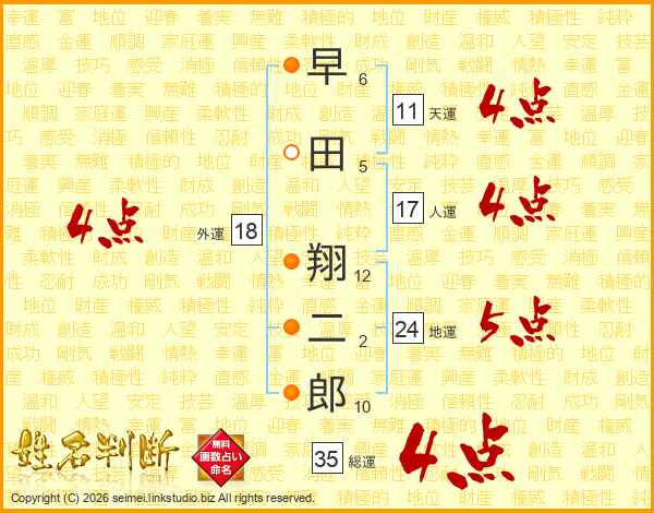 早(6画)田(5画) 翔(12画)二(2画)郎(10画)