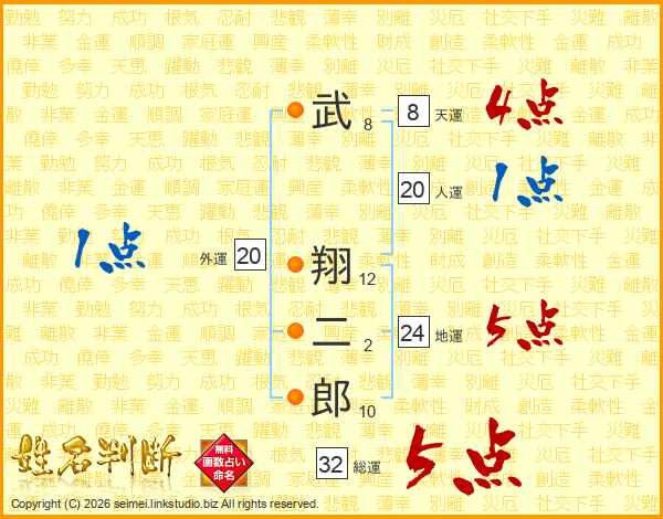 生活面を象徴する運勢です。外部から受ける影響力を表し、結婚運、家庭運や職場、環境への順応性を表します。総運から人運を引いた画数。姓や名が1文字の場合を除く。