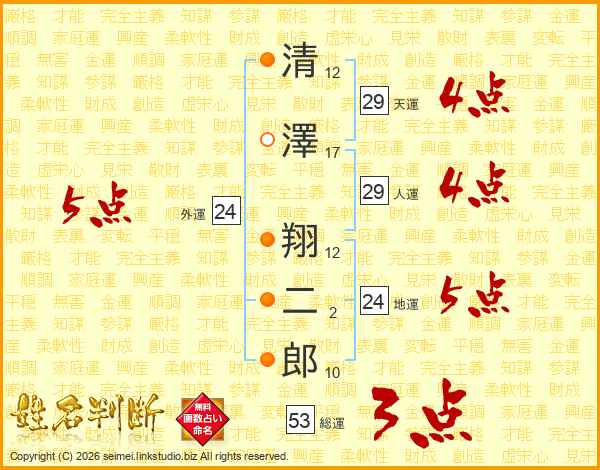 清澤翔二郎さんの総運は53画の3点!