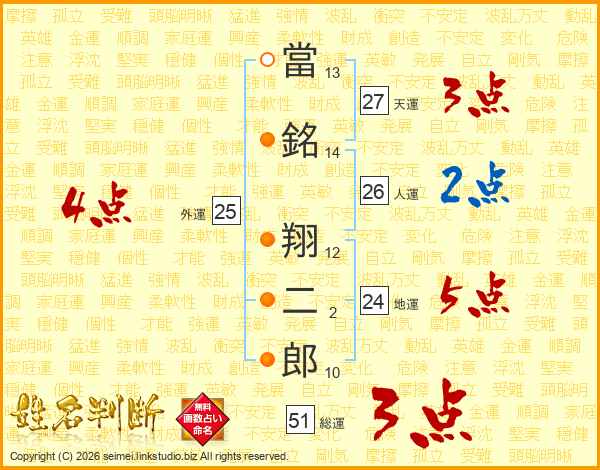 當(13画)銘(14画) 翔(12画)二(2画)郎(10画)