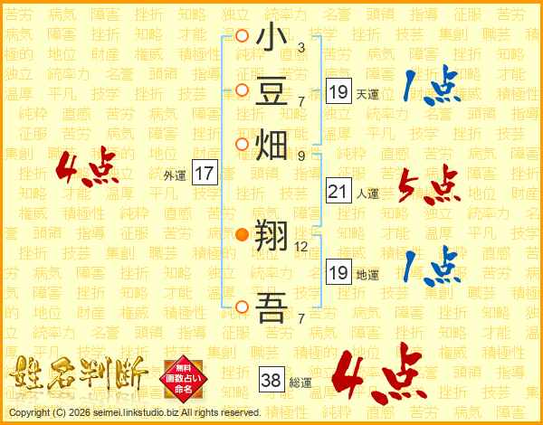 小豆畑翔吾さんの総運は38画の4点!