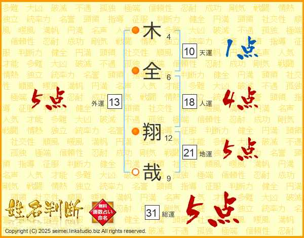 生活面を象徴する運勢です。外部から受ける影響力を表し、結婚運、家庭運や職場、環境への順応性を表します。総運から人運を引いた画数。姓や名が1文字の場合を除く。