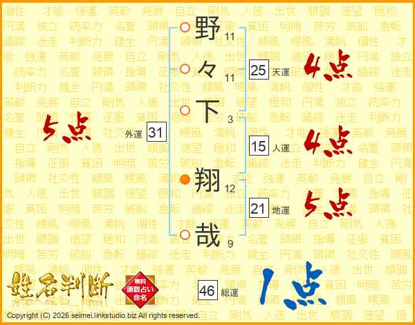 野(11画)々(11画)下(3画) 翔(12画)哉(9画)
