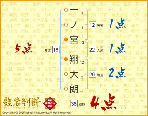 一(1画)ノ(1画)宮(10画) 翔(12画)大(3画)朗(11画)