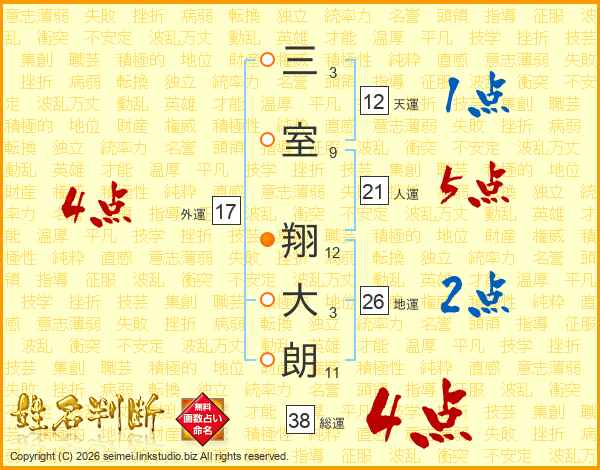三(3画)室(9画) 翔(12画)大(3画)朗(11画)
