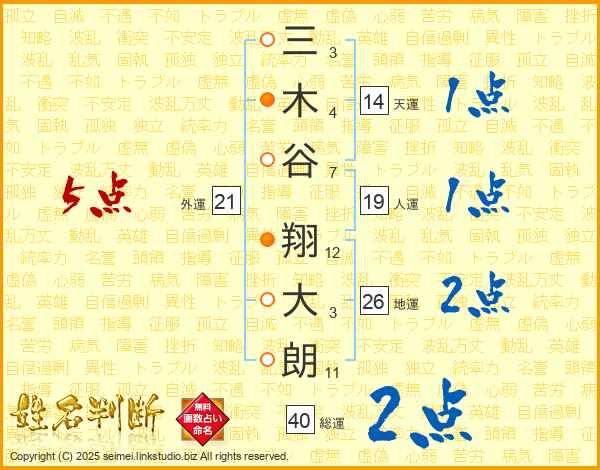 三(3画)木(4画)谷(7画) 翔(12画)大(3画)朗(11画)