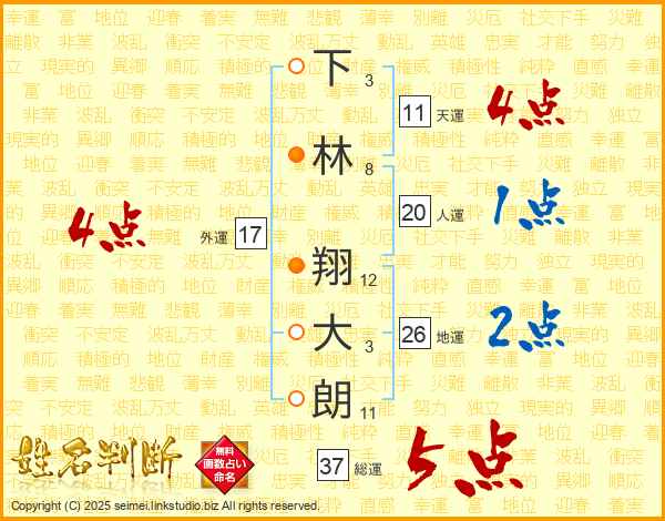 下(3画)林(8画) 翔(12画)大(3画)朗(11画)