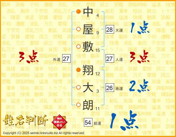 中(4画)屋(9画)敷(15画) 翔(12画)大(3画)朗(11画)