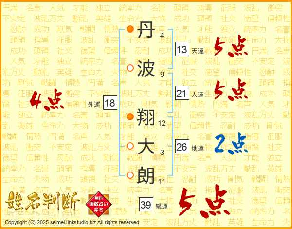 丹(4画)波(9画) 翔(12画)大(3画)朗(11画)