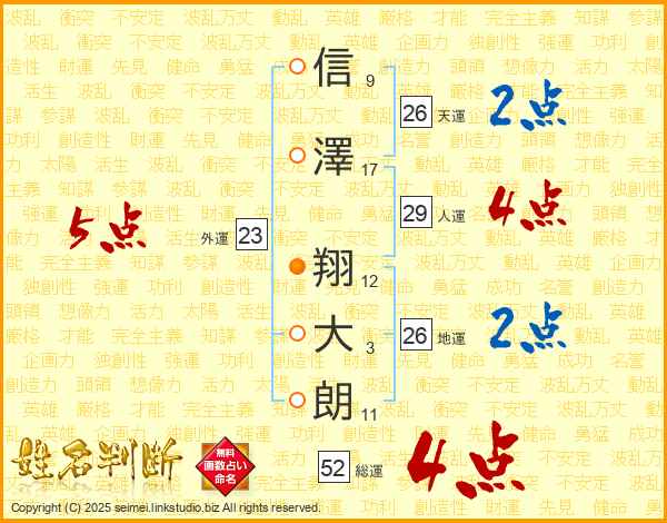 信(9画)澤(17画) 翔(12画)大(3画)朗(11画)