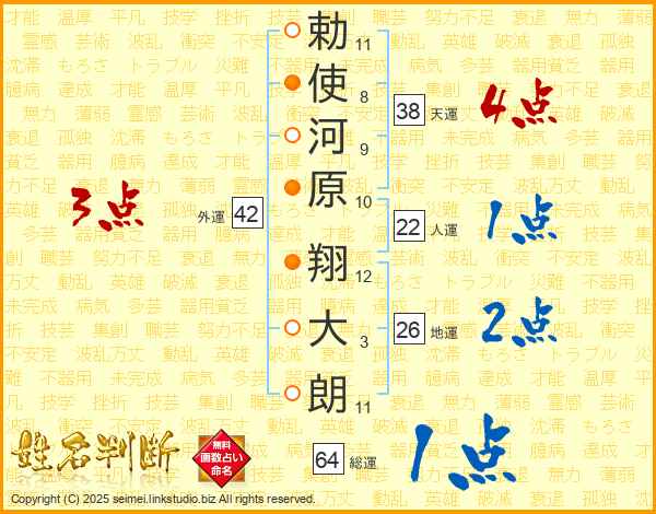 勅(11画)使(8画)河(9画)原(10画) 翔(12画)大(3画)朗(11画)