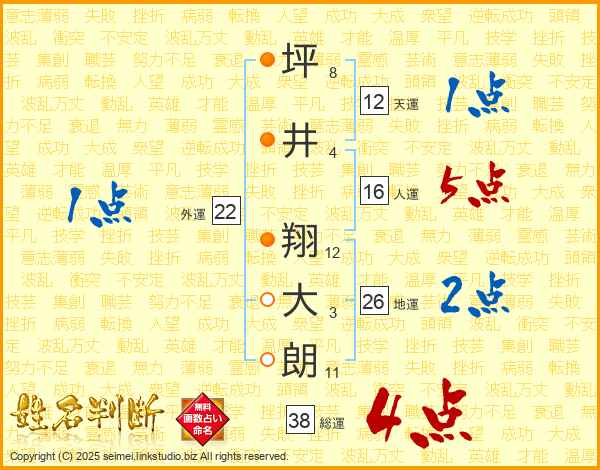 坪(8画)井(4画) 翔(12画)大(3画)朗(11画)