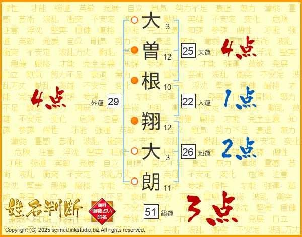 大(3画)曽(12画)根(10画) 翔(12画)大(3画)朗(11画)