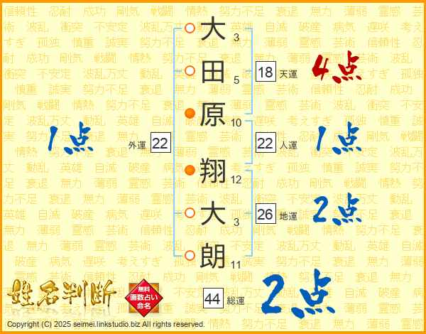 大(3画)田(5画)原(10画) 翔(12画)大(3画)朗(11画)
