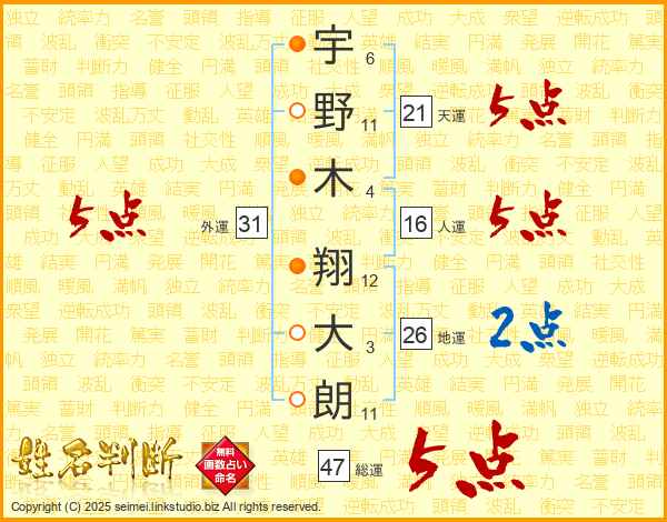 宇(6画)野(11画)木(4画) 翔(12画)大(3画)朗(11画)