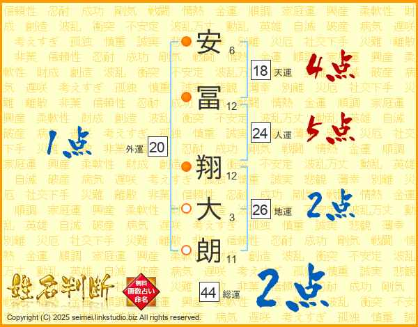 安(6画)冨(12画) 翔(12画)大(3画)朗(11画)