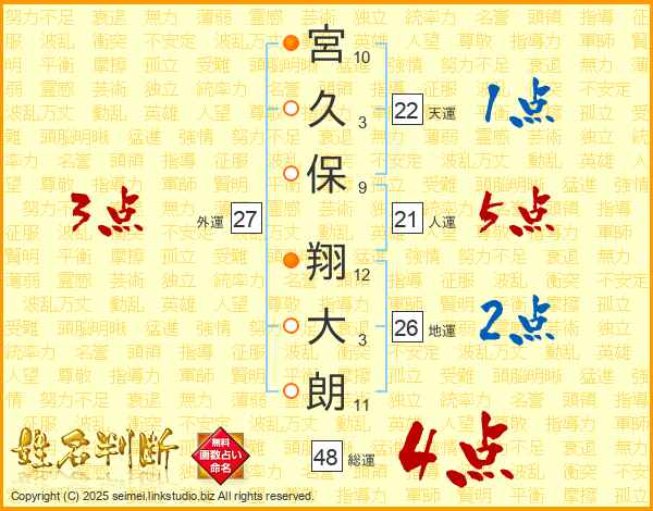 宮(10画)久(3画)保(9画) 翔(12画)大(3画)朗(11画)
